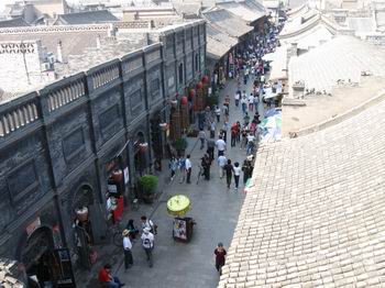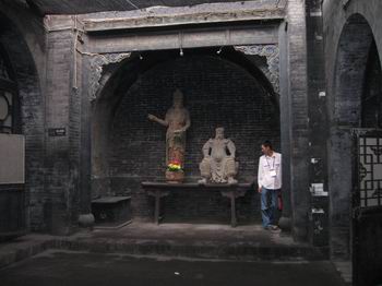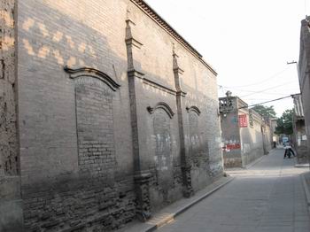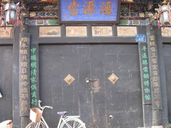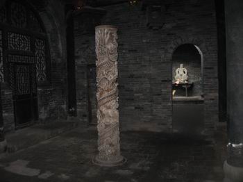 平遙古城內(nèi)的景點比較多的是票號,十八個景點我們只去了十個,其他的都是票號和鏢局,內(nèi)部擺設(shè)大同小異。票號始祖“日升昌”當然是非去不可的,除了建筑外觀與現(xiàn)代銀行不一樣外,內(nèi)部機構(gòu)設(shè)置簡直就是現(xiàn)代銀行的翻版。當然,這種說法應該反過來,現(xiàn)代銀行是無數(shù)個“日升昌”的翻版。還有“協(xié)同慶票號”,以其巨大的地下金庫聞名,它地下的部分和地上的部分是一樣大面積,從隱蔽的入口沿石階小心走下去,好似進入一個大天井,天井四周是一扇扇小門,里面就是堆放真金白銀的小倉庫。天井正中一根盤龍石柱,高約二人,粗有半米,一條龍完整的沿柱子盤旋上升,雕工細致而不繁瑣,這在平遙是很少見的雕工。在一家票號內(nèi)我們還見到了接待客人的地方擺著一張煙塌,在票號,抽大煙是嚴禁的。這張煙塌設(shè)在談判的房間,可見是專門用于接待客人的,有些類似于現(xiàn)代的請客吃飯洗桑拿。至于鏢局,當然是和票號同生共長的行業(yè)。內(nèi)部迎面一排武器架,大刀鐵錘的雖不至于十八般兵器全了,不過也挺震撼的。幾乎每個鏢局院內(nèi)都有一個大約一米的石頭元寶,意為招財進寶。