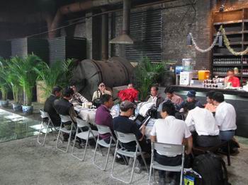 在柴油機廠展區(qū)的作品是比較知名的攝影家的作品,以風景照居多,還有人物特寫。柴油機廠展區(qū)的作品都是因地制宜擺放,一臺臺油乎乎的機床上面這兒擺一幅那里擺一幅,全非一般展覽那種正經(jīng)八百的布展方式。然而這種奇特的結(jié)合在這座古城竟然讓人感覺很正常,似乎天生就應該是這樣子的。崎嶇不平的土路并不好走,那天天氣還非常炎熱,是我們在山西這五天內(nèi)最炎熱的一天。在柴油機場最里側(cè)有一家很著名的平遙酒吧。酒吧外是汾酒搭建的一個大棚做促銷,小瓶裝竹葉青才五元一瓶,不愧是原產(chǎn)地,就是便宜,在外地都要賣到十四一瓶。酒吧內(nèi)沒有任何裝飾,就是利用柴油機廠的一間廠房改造而成,屋頂?shù)醯暮芨?,南面的墻上兩人高的地方是一排類似百葉窗的木窗子,酒吧內(nèi)黑乎乎的,光線透過窗外斑駁的樹葉射進室內(nèi),一縷縷陽光就像紡紗的絲線,縷縷清晰可見,真是說不出的藝術(shù)感,吸引了很多人端著相機一陣狂拍。