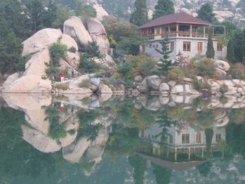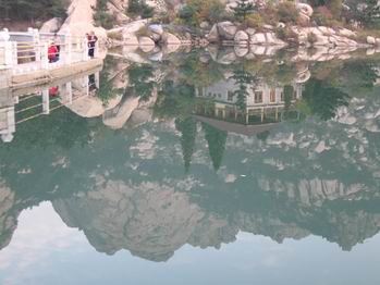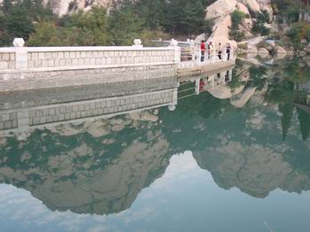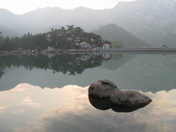二龍山的石頭非常有特色,與浮山的石頭氣勢截然不同。如果說浮山的山石是桀驁不馴的藝術(shù)家,那么二龍山的石頭就是粗重大氣的山東大漢。遠(yuǎn)遠(yuǎn)近近、層層疊疊的山峰似無數(shù)張?zhí)鴦?dòng)的心電圖重疊在一起,一個(gè)波峰接一個(gè)波峰,深深淺淺的色彩似隨意灑脫的潑墨山水。山腳一個(gè)大壩,上游不經(jīng)意流下來的細(xì)細(xì)水流,到這里竟然匯聚成一汪碧綠的深潭,碧波蕩漾溫柔恬靜如二八少女,更反襯出山巒的雄偉蒼翠。