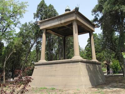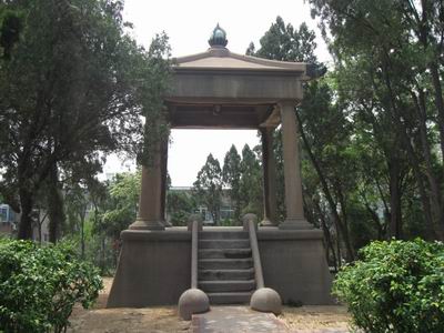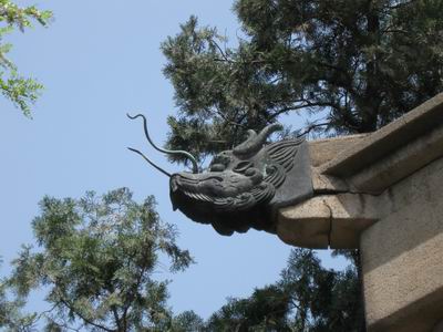 離神社不遠(yuǎn)的山坡上,現(xiàn)在是一座小公園,進(jìn)門就有一座風(fēng)格迥異的涼亭,它的線條與中國(guó)古典亭閣絕然不同,四角各有一個(gè)龍首,綠銹斑斑,原來是銅的,龍須昂首,完好無損,亭上是一朵銅制蓮花。亭子原來掛有銅鐘,現(xiàn)在只剩掛鈕還在。大日本帝國(guó)的喪鐘已經(jīng)不知去向。