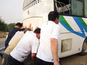 導(dǎo)游為了推薦大家購(gòu)物,極力夸贊云臺(tái)山的玉有多么神奇,說(shuō)她買(mǎi)了一個(gè)玉鐲,不帶時(shí)旅游就會(huì)碰到麻煩。不幸這次半路旅游車(chē)壞了,估計(jì)是導(dǎo)游又忘記帶玉鐲了,害得大家下去推車(chē)。